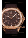 Brown Colored Textured Dial with Date Window at 3 O'Clock. Diamonds Bezel