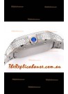 Diamonds Embedded Dial with Roman Hour Numerals, Date Window at 6 O'Clock and Signature Cartier Markings at the 7 O'Clock Counter. Blue Sapphires on Stem Tip