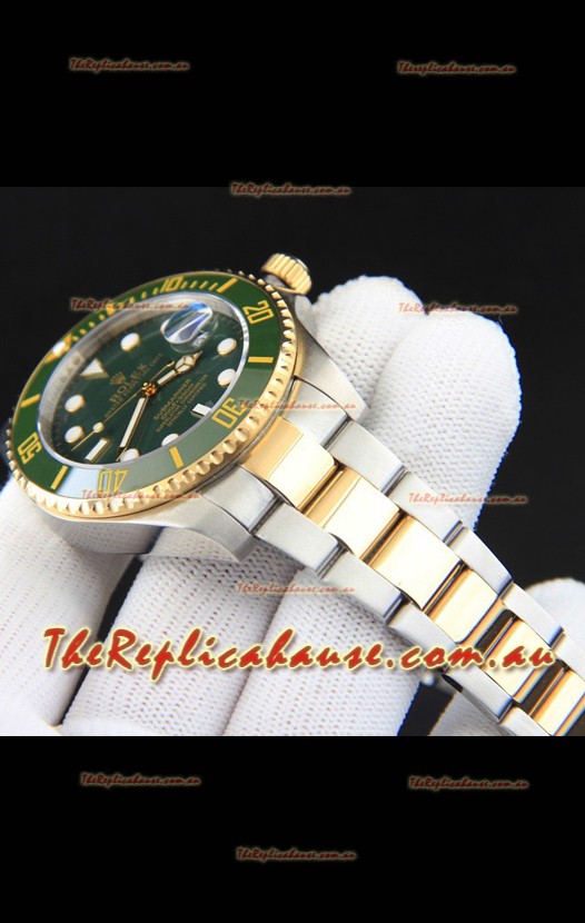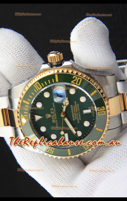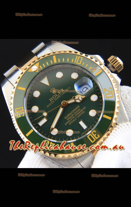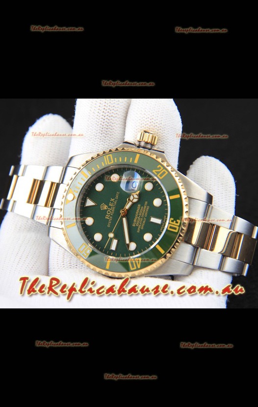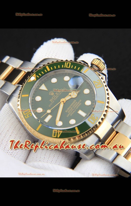 You're reviewing: Rolex Submariner Japanese Replica Watch in 2 Tone Yellow Gold Casing Green Dial