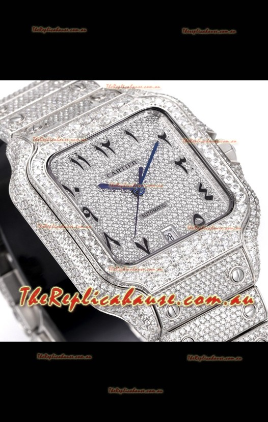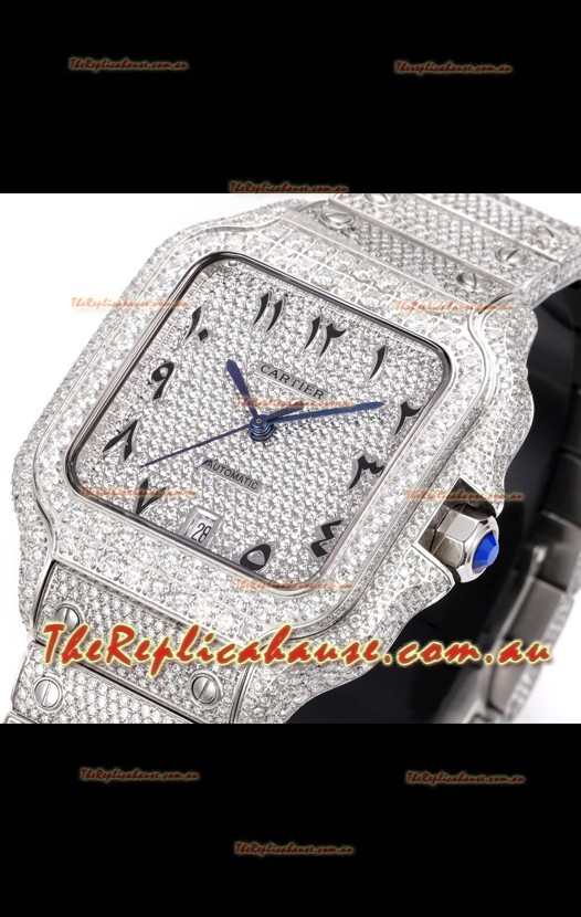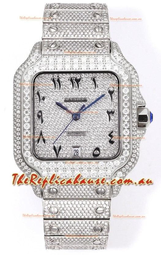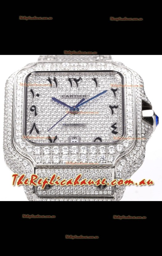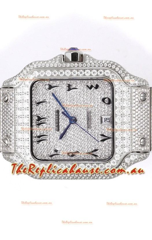 Cartier "Santos De Cartier" Stainless Steel W/ Diamonds Arabic Dial 1:1 Mirror Replica - 40MM - Genuine Diamonds