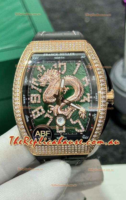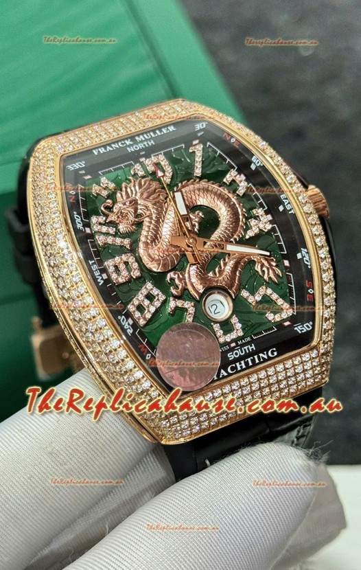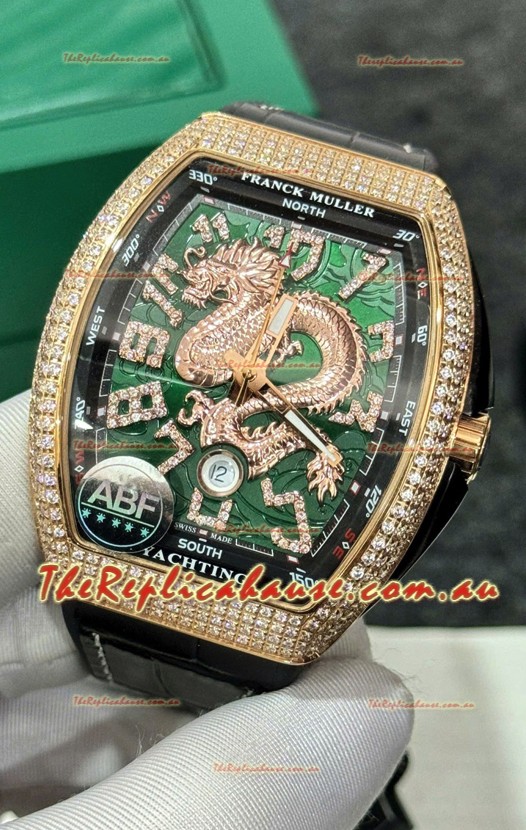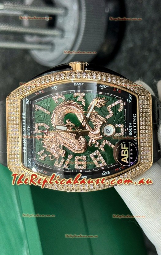 Franck Muller Vanguard Yachting Dragon V45 Green Dial in Gold Diamonds Bezel Swiss Replica