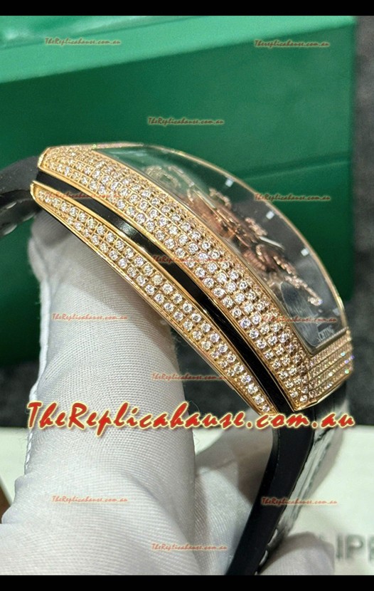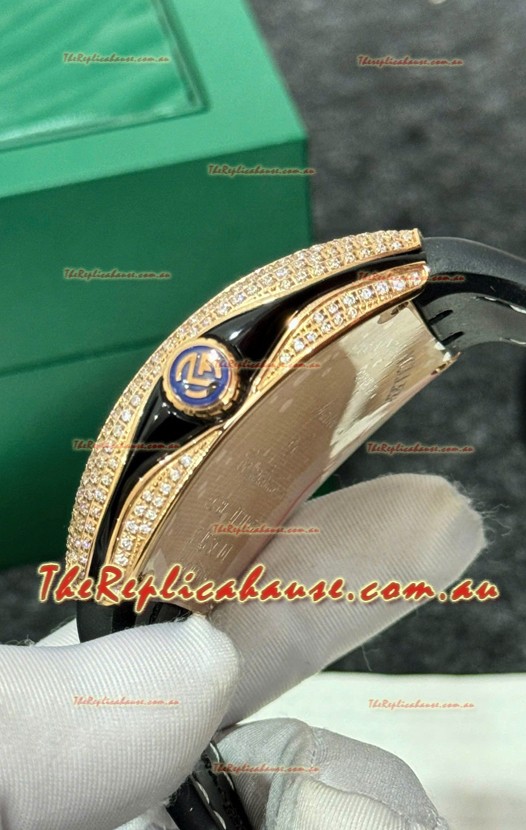 18K Rose Gold Plating on 904L Steel Case with Diamonds Paved Bezel