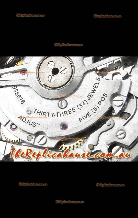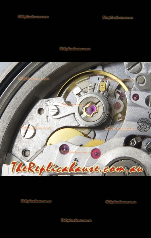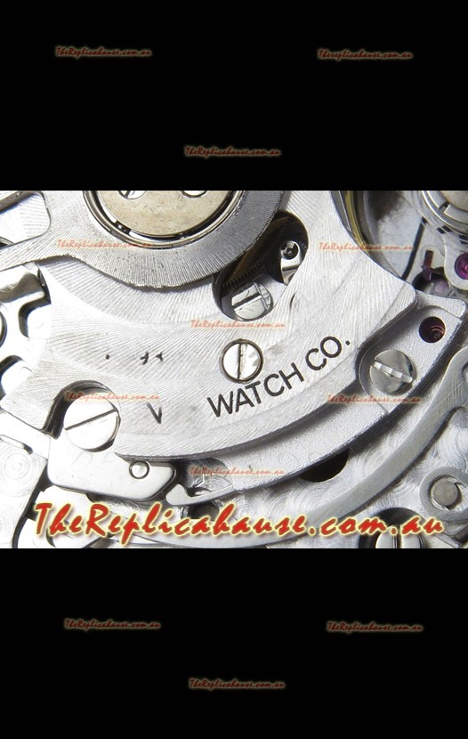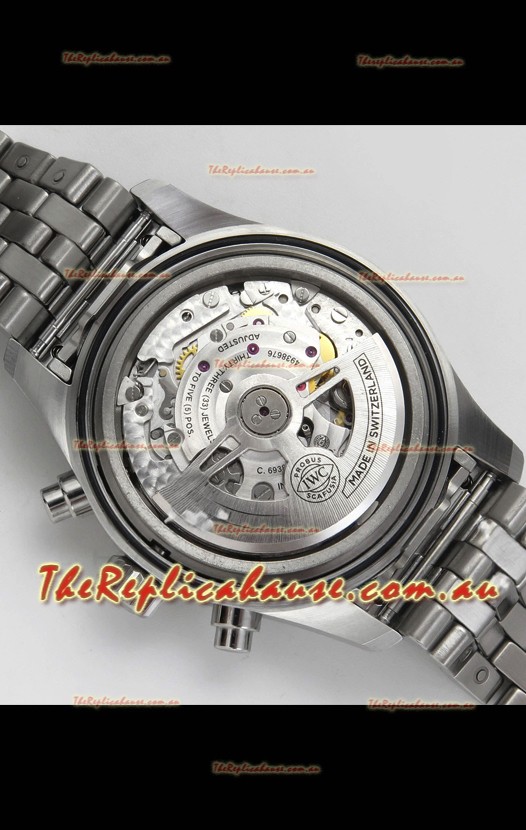 Base 7750 Movement Modified to Resemble the IWC 69385 Movement. Platinum Decodated Plate and Rotors. The Most Identical Machinery setup when compared with the Originals.