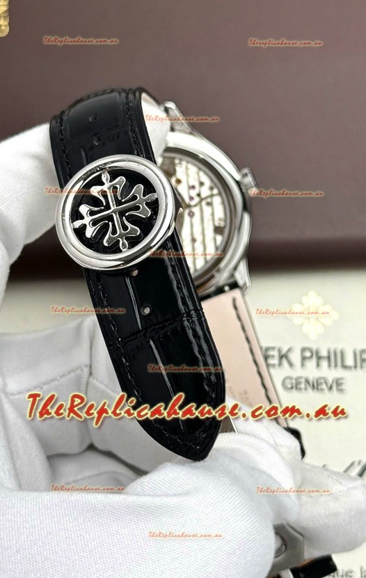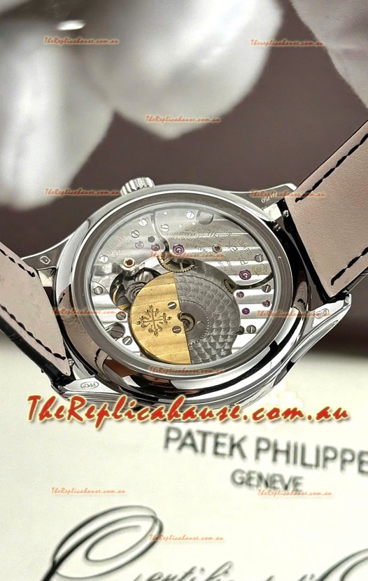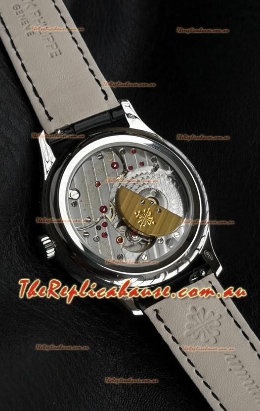 Genuine Swiss 9015 Movement assembled to Resemble the Authentic Patek Philippe PP 324 Calibre Style Movement. Updated Rotor, Bridged and Engravings on Movement with Rose Gold Plated Patek Philippe Stamped Rotor
