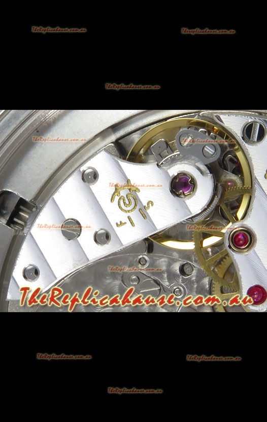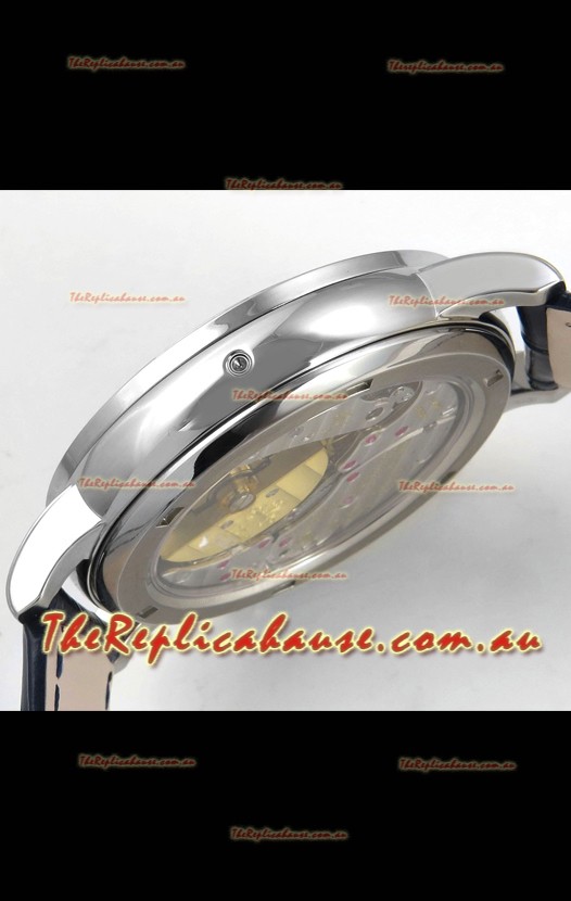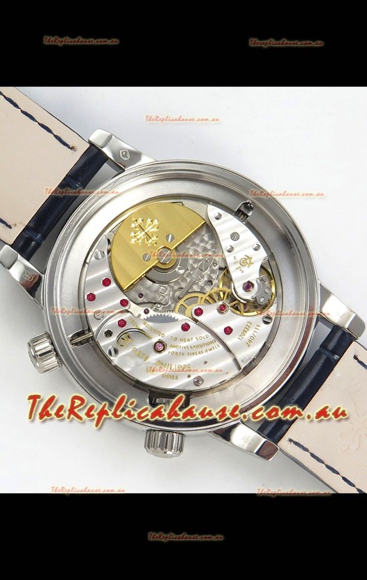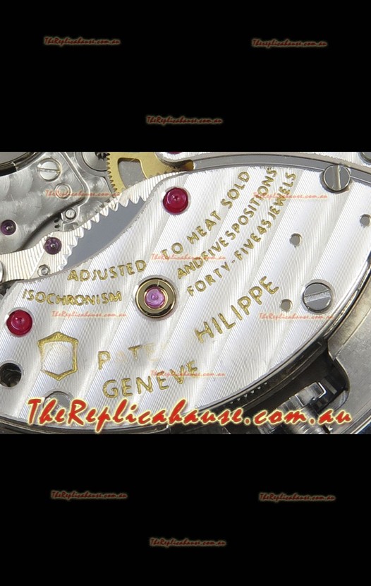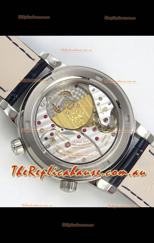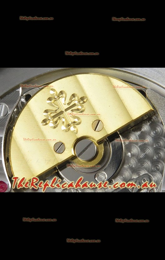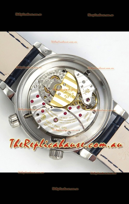 Genuine Swiss 9015 Movement assembled to Resemble the Authentic Patek Philippe PP 240 Calibre Style Movement. Updated Rotor, Bridged and Engravings on Movement with Rose Gold Plated Patek Philippe Stamped Rotor