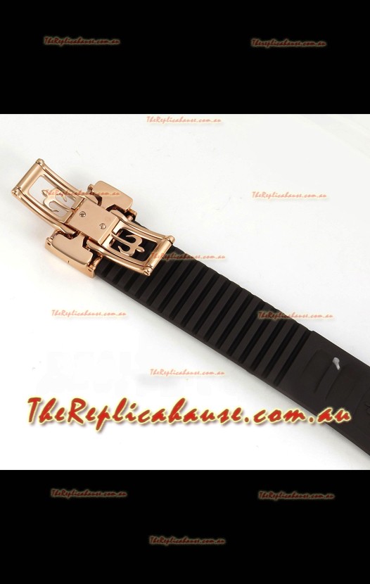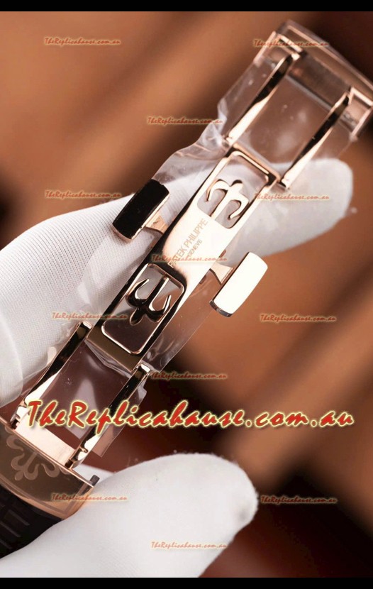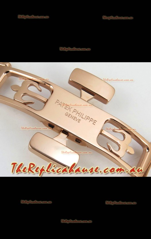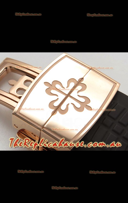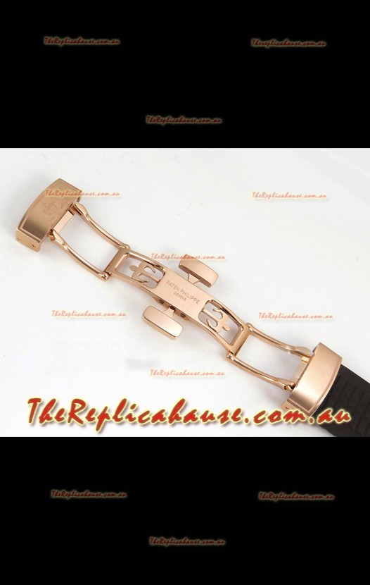 Brown Curved Rubber Strap with Rose Gold Plating on Steel Folding Clasp complete with Patek Philippe Markings. A Highly Updated Clasps for this series with much more accurate markings/engravings.