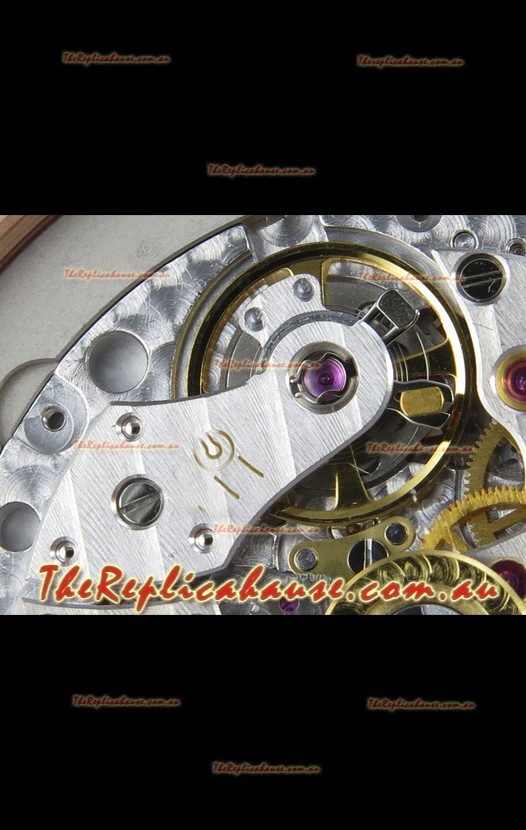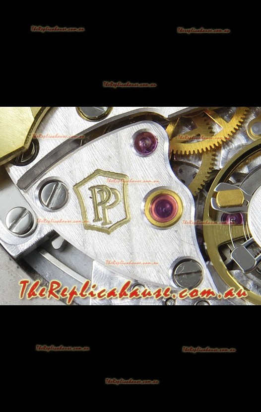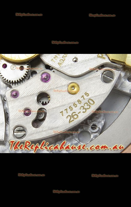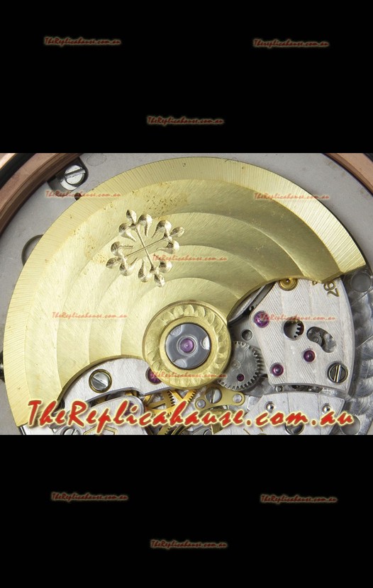 Genuine Swiss 9015 Movement assembled to Resemble the Authentic Patek Philippe PP 330 CS Calibre Style Movement. Updated Rotor, Bridged and Engravings on Movement.