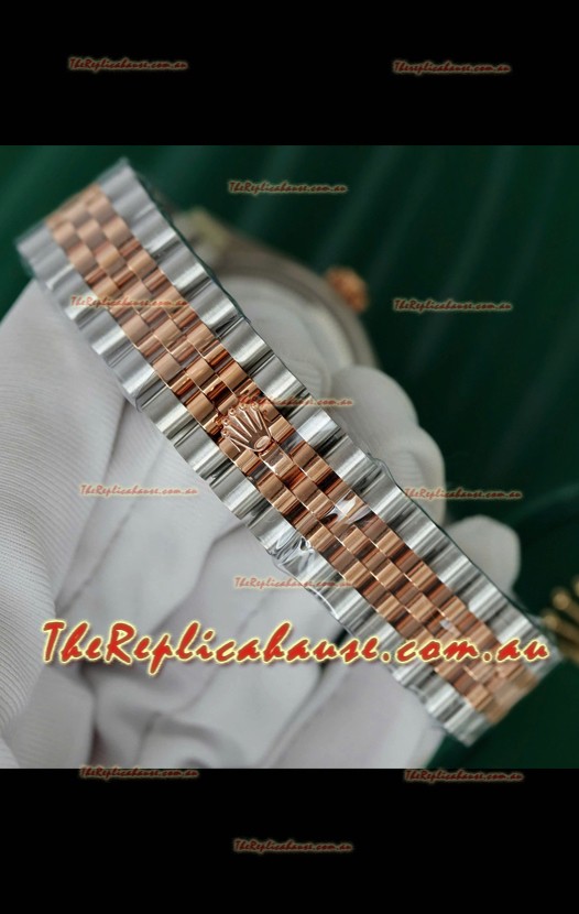 18K Rose Gold Plating on 904L Stainless Steel Two Tone Strap with New Style Rolesor Deployant Buckle, End links match up Flush with the Case. - A Much Improved Datejust Strap Version