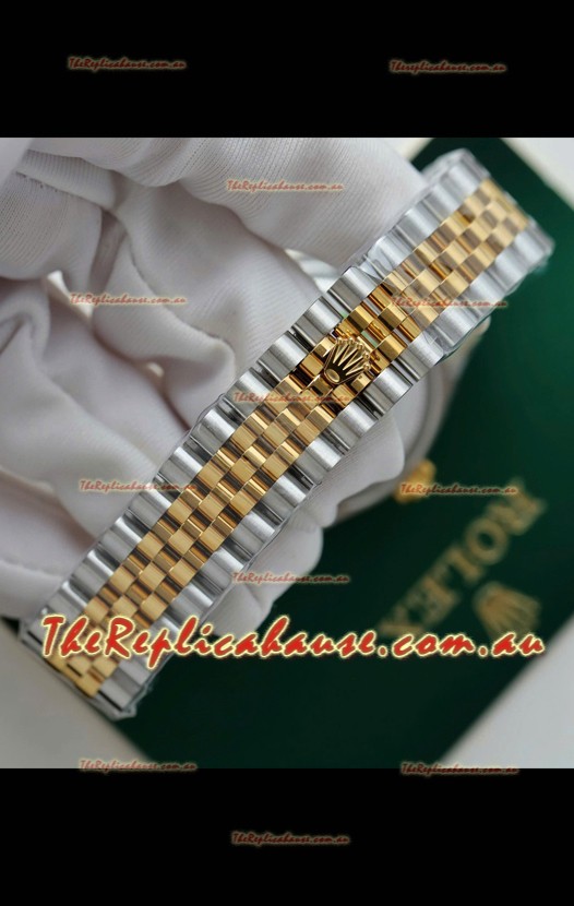 18K Yellow Gold Plating on 904L Stainless Steel Two Tone Strap with New Style Rolesor Deployant Buckle, End links match up Flush with the Case. - A Much Improved Datejust Strap Version